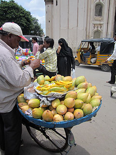 ![]() A man selling mango fruit from the back of his bicycle. |