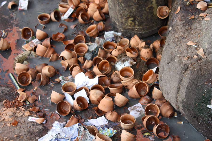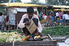 ![]() This man is cooking corn to sell to people near a temple. |