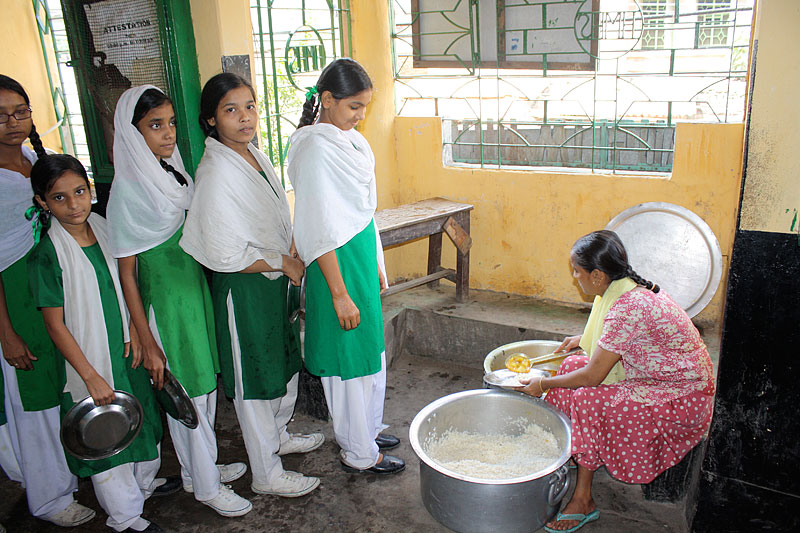 ![]() A school lunch line. These girls eat rice and dahl. Dahl is made with lentils. |