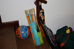 ![]() This is a cricket bat, ball, and tennis racket. ![]() These boys are playing roller hockey at school. |